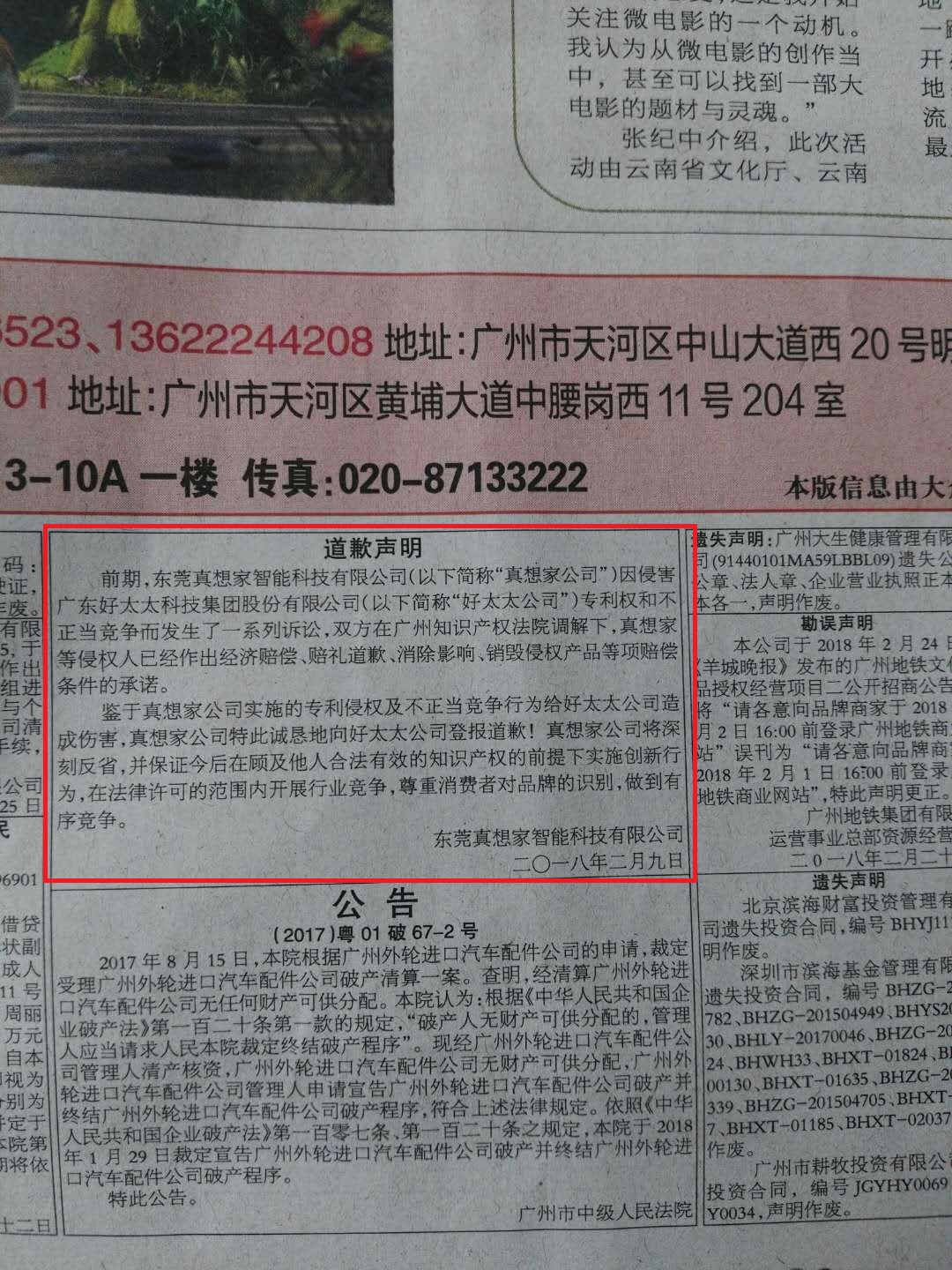 侵權企業“真想家”在《羊城晚報》刊登道歉聲明。