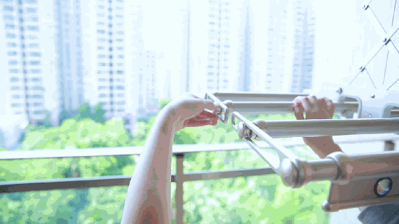 過去江家的陽臺,只有兩條鐵桿當晾桿,晾曬的空間非常有限,還需要人力一件一件反復去掛衣服,有時候洗了床單被子,晾桿就不夠用,只能在陽臺找其他位置晾,陽臺變成了雜亂的曬衣房,一點也不美觀。