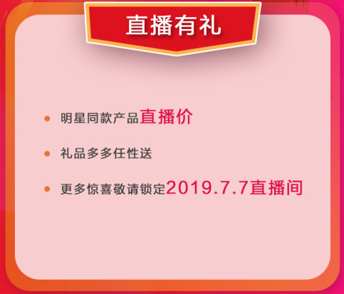通過線上直播系統,客戶可自由選擇在線上微商城或線下門店下單,均可享受直播價,禮品多多狂歡送。更多驚喜敬請鎖定2019年7月7日直播間
