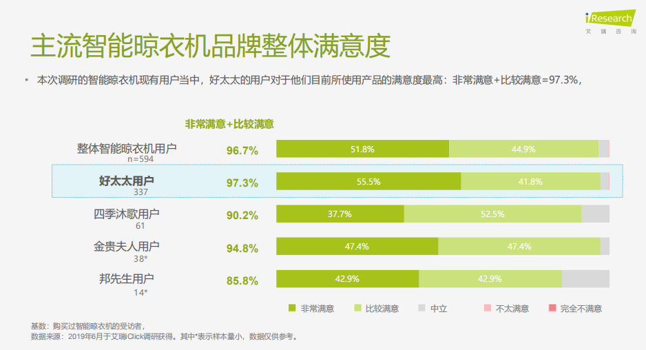 報(bào)告數(shù)據(jù)公開(kāi)可知,好太太的品牌認(rèn)知度更是達(dá)到78.6%,且調(diào)研的已購(gòu)買和正在使用智能晾衣機(jī)的消費(fèi)者當(dāng)中,近6成購(gòu)買過(guò)好太太的智能晾衣機(jī),他們對(duì)目前所使用產(chǎn)品的滿意度最高達(dá)到 97.3%。數(shù)據(jù)背后體現(xiàn)的是,所有品牌晾曬市場(chǎng)都不及好太太一家的體量大,好太太在業(yè)內(nèi)占不僅是“大牌子”,而是“超級(jí)大牌”。