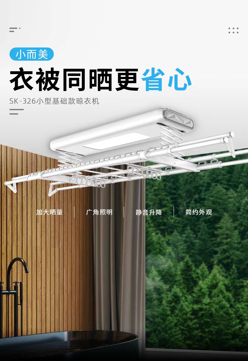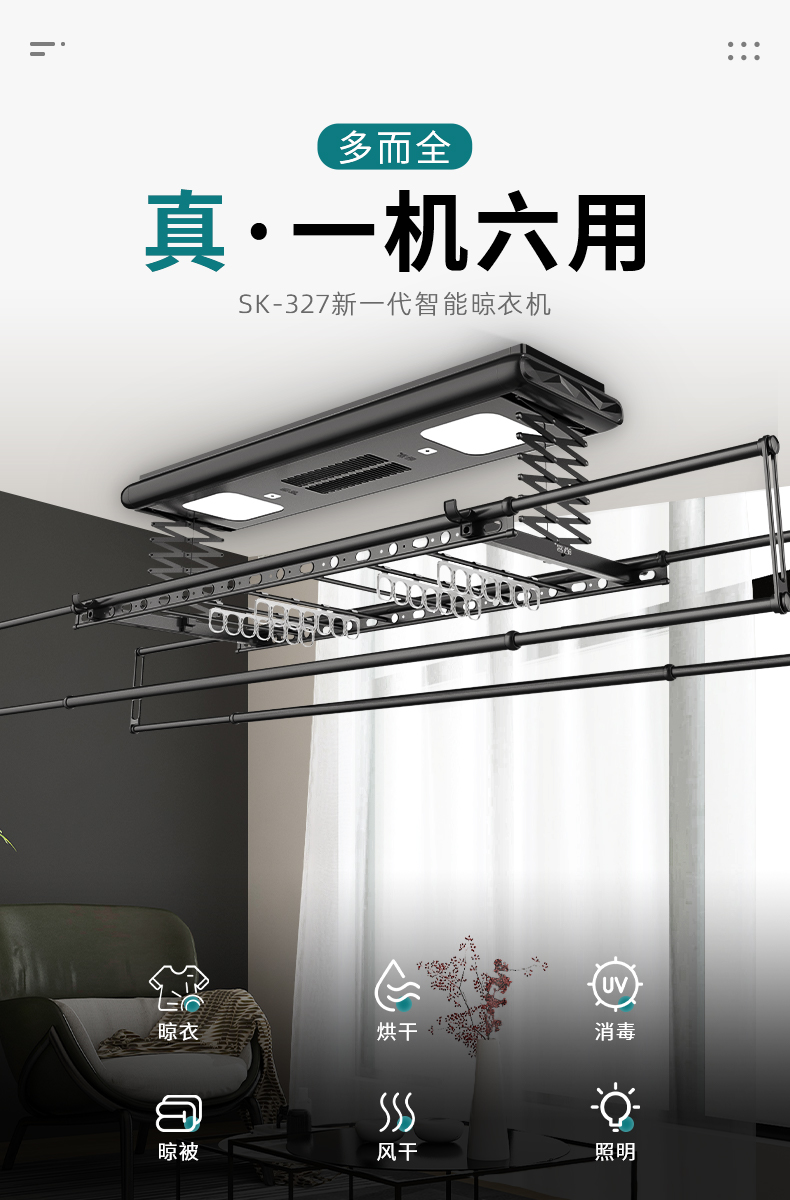 多功能智能晾衣機SK-327,晾衣、烘干、消毒、晾被、風干、照明,一機六用,為織物護理提供全方位細致化服務。